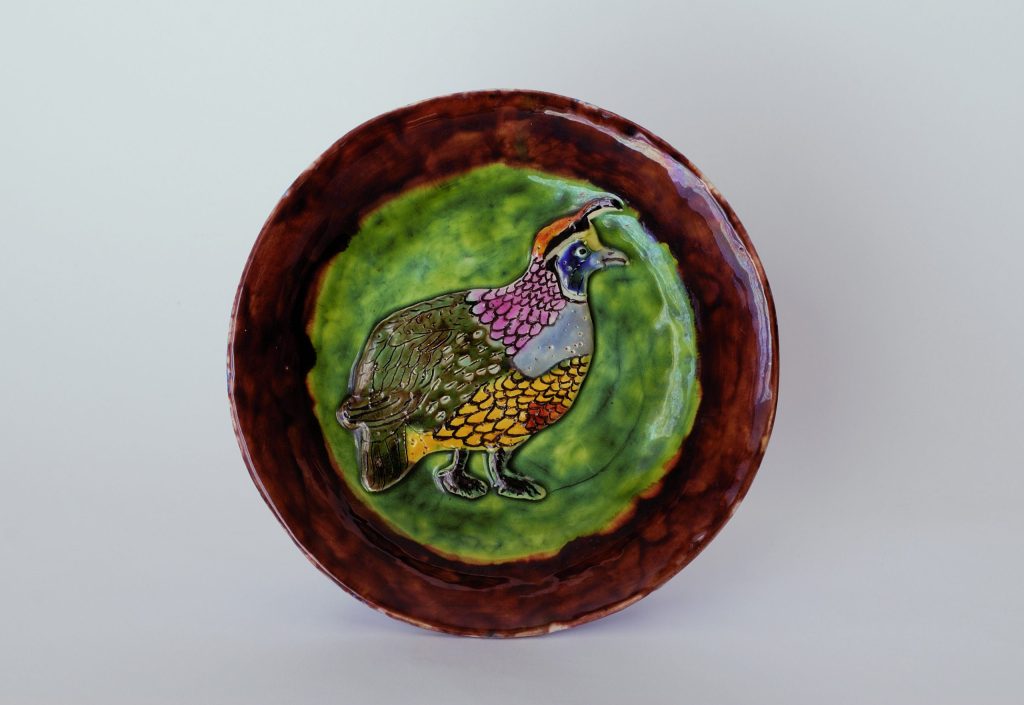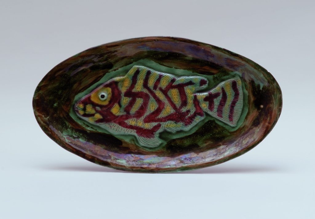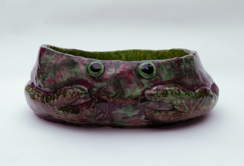 (....) The forms are moulded or modelled: the plates are probably stamped in an impression, the containers modelled (jug, pot, soup tureen), giving them an air of slouching full of life since the expression of strength is pushed from within the volume, as are his zoomorphic sculptures (eels). His crab-shaped bowl is a great success. There is Carriès in him, a Carriès mixed with Palissy. His forms and iconography are part of the old French tradition of imagination: we think of his Zodiaque series, where the symbols of the signs are pure Romanesque. He brought to it the freshness of a naïve repertoire that appealed to the purists. His sensitivity is matched by a hunter-fisherman's sense of observation. Drawn from this experience of nature, his natural breeding ground, the animals or plants that are friends of the gatherer, such as mushrooms, are captured in an attitude, a pose characteristic of their species. The only difference is that the colours are bright, whimsical, often unrealistic, and enhanced - almost mirror-like - by a high-gloss varnish that densifies the whole. The plates are heavy, dense and full. Nothing to take away, nothing to add. A perfect egg: the transition from nature to culture (...).