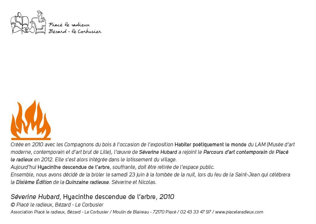 L’association Piacé le radieux, Bézard – Le Corbusier fête ses 10 ans ! Le bâtiment accueillant actuellement l’exposition “Bézard – Le Corbusier : La Ferme radieuse et le village coopératif” est en travaux ; un nouvel espace entièrement consacré au projet de Bézard et Le Corbusier sera inauguré le samedi 23 juin à l’occasion de l’ouverture de la 10ème édition de La Quinzaine radieuse. La soirée se poursuivra avec un repas champêtre et un feu de la Saint-Jean au cours duquel l’oeuvre de Séverine Hubard “Hyacinthe descendue de l’arbre” sera brûlée. Une exposition d’éditions et de multiples de l’artiste Claes Oldenburg se tiendra au rez-de-chaussée du Moulin.