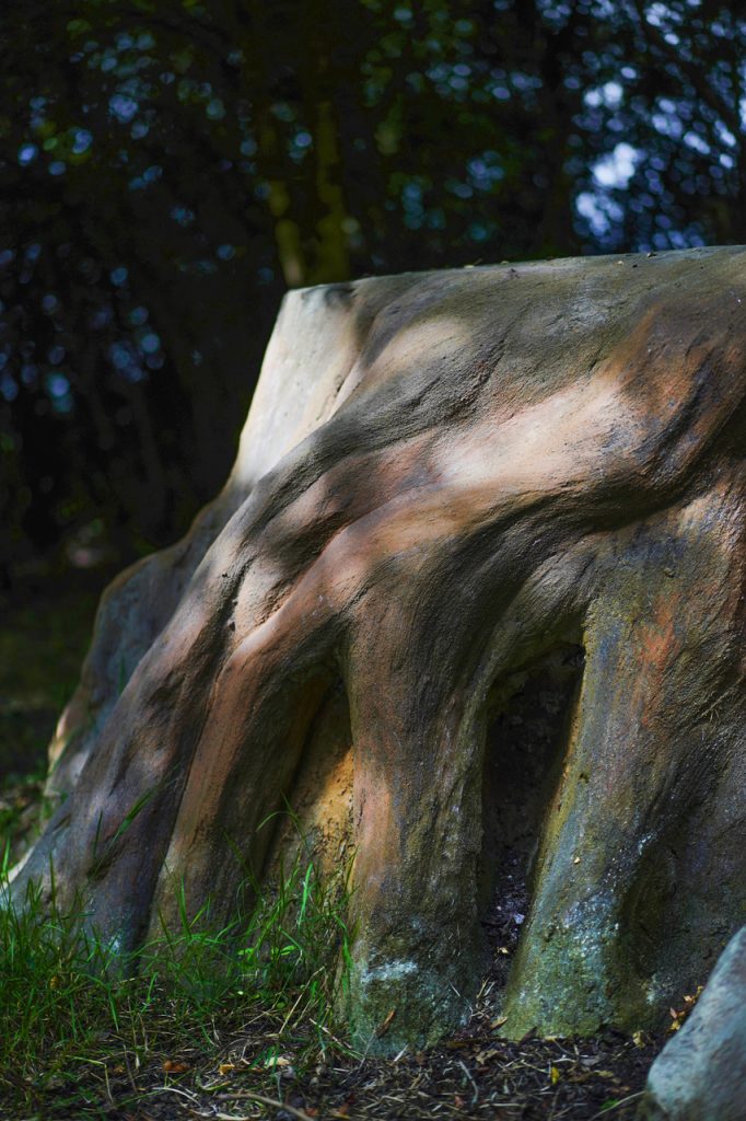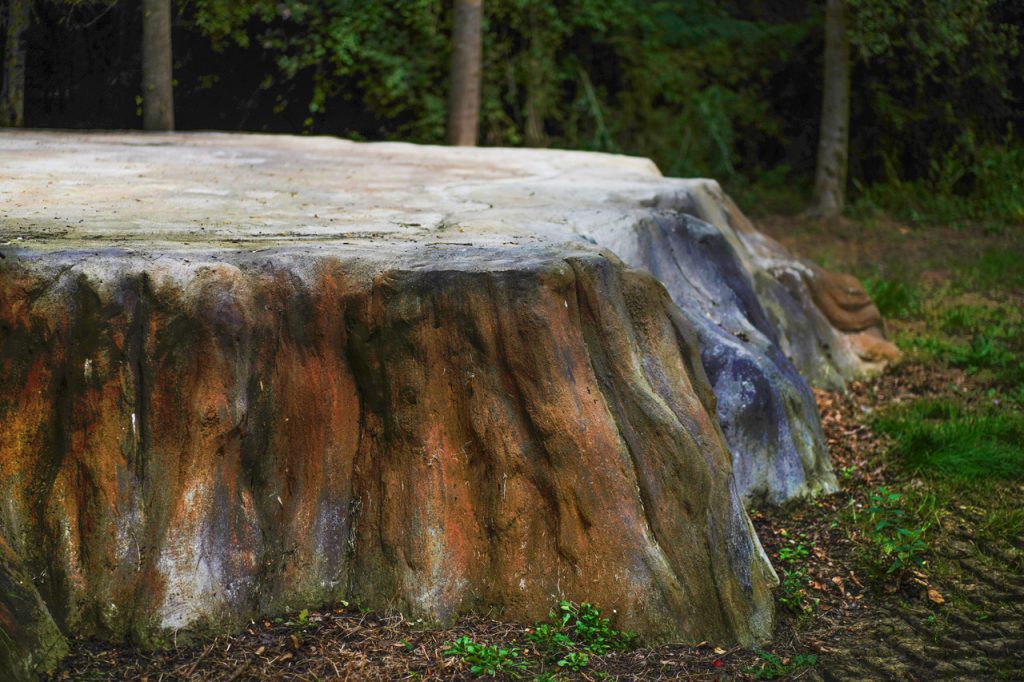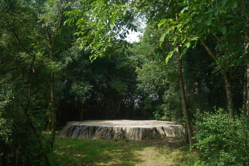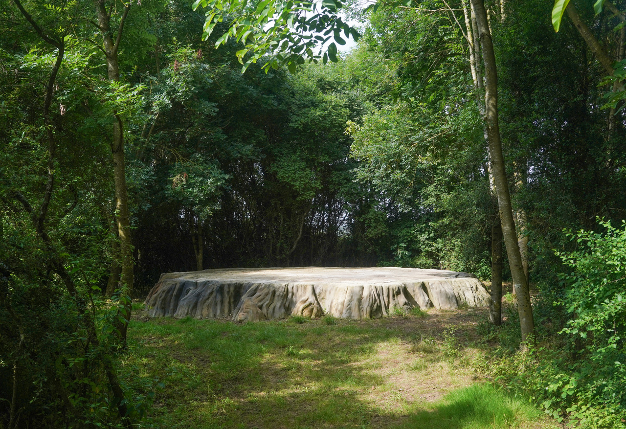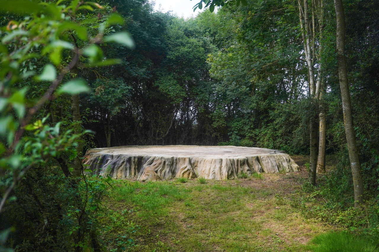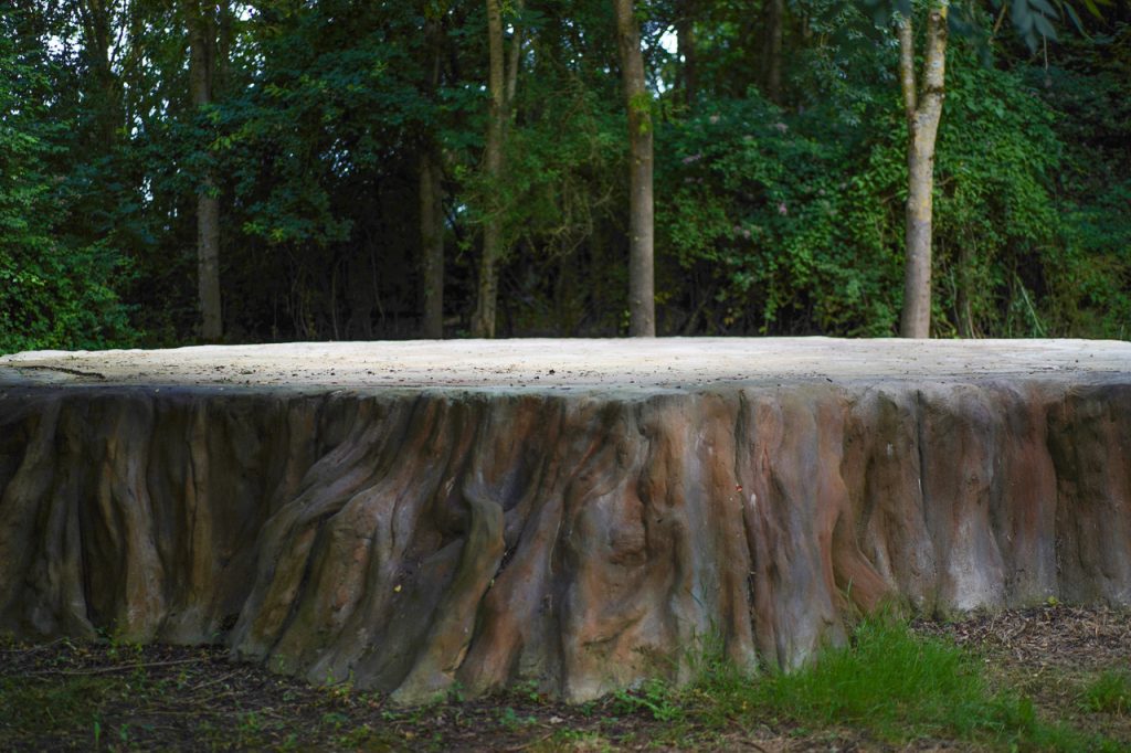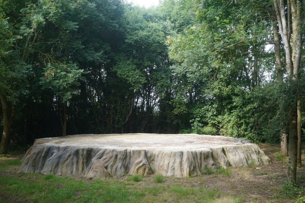 Big Stump (littéralement, grande souche) est une sculpture monumentale en rusticage qui reproduit une souche de séquoia géant. Le point de départ de ce projet de l’artiste Stéphane Vigny est la découverte d’une illustration d’archive : l’image montre la souche d’un séquoia géant de Californie venant d’être abattu, sur laquelle plusieurs dizaines de personnes sont en train de danser. Dans l’ouvrage Scenes of Wonder and Curiosity in California (1862), un commentateur de l’époque, James M. Hutchings, décrit la scène suivante : « Aussi incroyable que cela puisse paraître, sur cette souche, le 4 juillet 1854, trente-deux personnes se sont mises à danser quatre ensembles de cotillons à la fois, sans aucun inconvénient ; et à côté de ceux-ci, il y avait des musiciens et des spectateurs. » Large d’environ 8 mètres de diamètre et haute de 1 mètre, Big Stump a été inaugurée le dimanche 18 juin avec un concert de musique baroque (Ensemble Zéphyre) dans le cadre de la Quinzaine radieuse # 15. Cette sculpture sera ponctuellement utilisée comme plateau de scène. Réalisée avec le concours du maçon rocailleur Philippe Le Féron de Longcamp, la fabrication de cette oeuvre a fait l’objet d’un atelier d initiation à la pratique du rusticage.