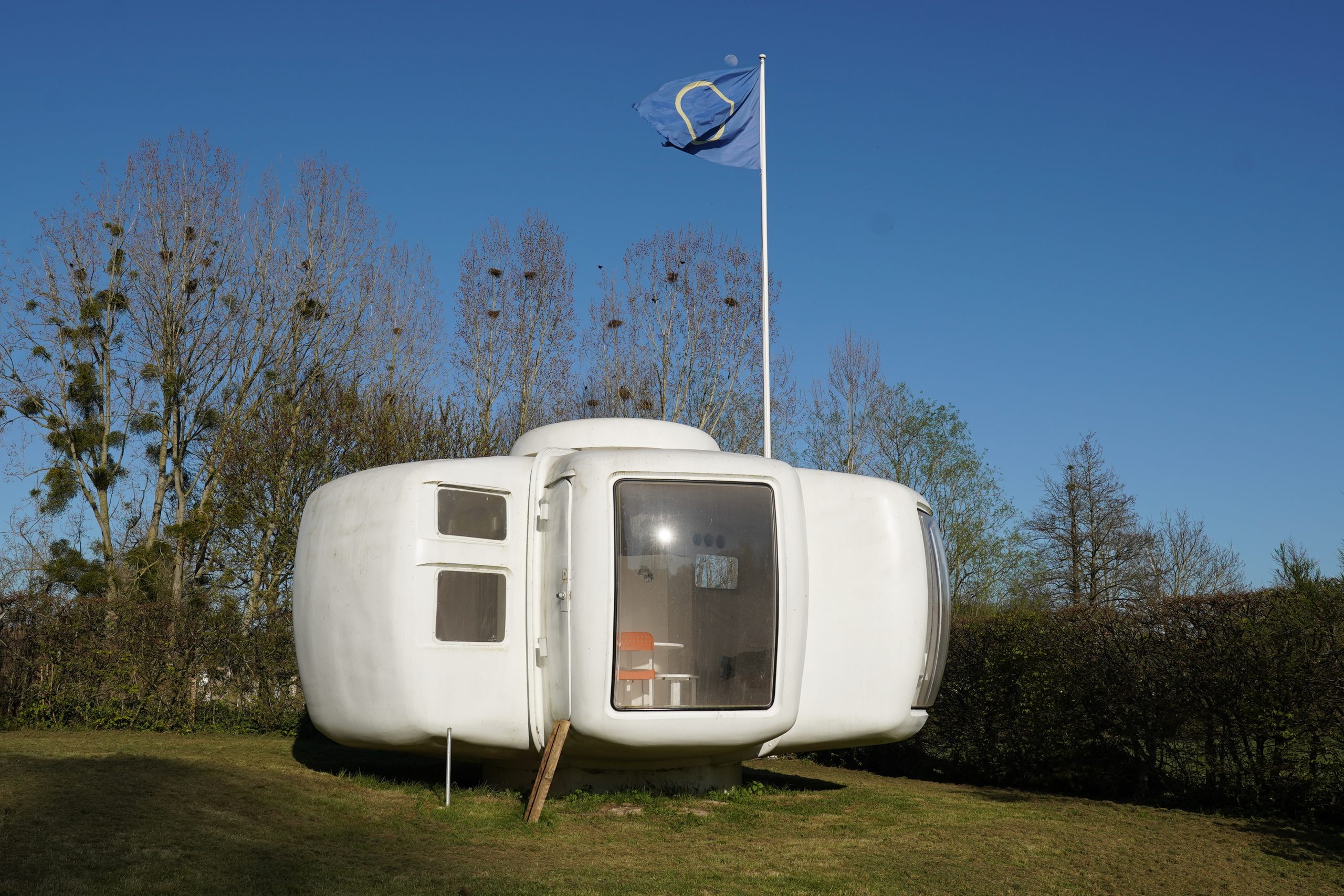 Formé à la fois comme architecte et urbaniste, Jean Maneval (1923-1986) participe à la reconstruction de la France d’Après-Guerre. Dans les années 1960, il est l’un des premiers à exploiter les possibilités offertes par les matériaux plastiques en architecture. Dès 1963 il réalise les premières esquisses de la Maison bulle à six coques. Fruit de la collaboration entre l’agence de Maneval et l’industrie pétrochimique du groupe ELF Aquitaine, elle est produite à 300 exemplaires entre 1968 et 1970. Formée de l’assemblage de six coques indépendantes de polyester surélevées sur un socle de béton, cette maison est pensée comme un habitat cellulaire: Maneval cherche à y rationaliser un espace de 36m2 en y apportant tout le confort moderne (sanitaires, chauffage, électricité…). L’aménagement intérieur qui se fait selon la demande du client, repose sur l’utilisation d’un mobilier intégré dont les formes courbes épousent la structure des coques. La Maison bulle à six coques est l’un des premiers exemples français d’architecture de plastique. Léger, résistant, facile à mettre en forme, peu onéreux à produire, le plastique permet ici la réalisation d’une architecture nomade, facilement transportable et rapidement montable (trois jours maximum). De plus, Maneval inscrit sa maison dans la mouvance Pop caractéristique de la période. Les choix de formes courbes, de couleurs vives, d’une commercialisation à bas prix, font de cette maison une habitation anticonformiste et futuriste, à la fois objet de consommation et architecture industrielle. Répondant au développement des congés payés et des loisirs, Maneval destine dès l’origine sa maison à un usage de villégiature. Le modèle présenté durant l’édition 2012 de la FIAC provient du village vacances de Gripp (Hautes-Pyrénées), qui regroupaient une trentaine de ces maisons et a fonctionné jusqu’en 1998. Aménagées pour accueillir jusqu’à six personnes, elles donnèrent pleine satisfaction aux vacanciers par leur côté ludique et leur facilité d’entretien.