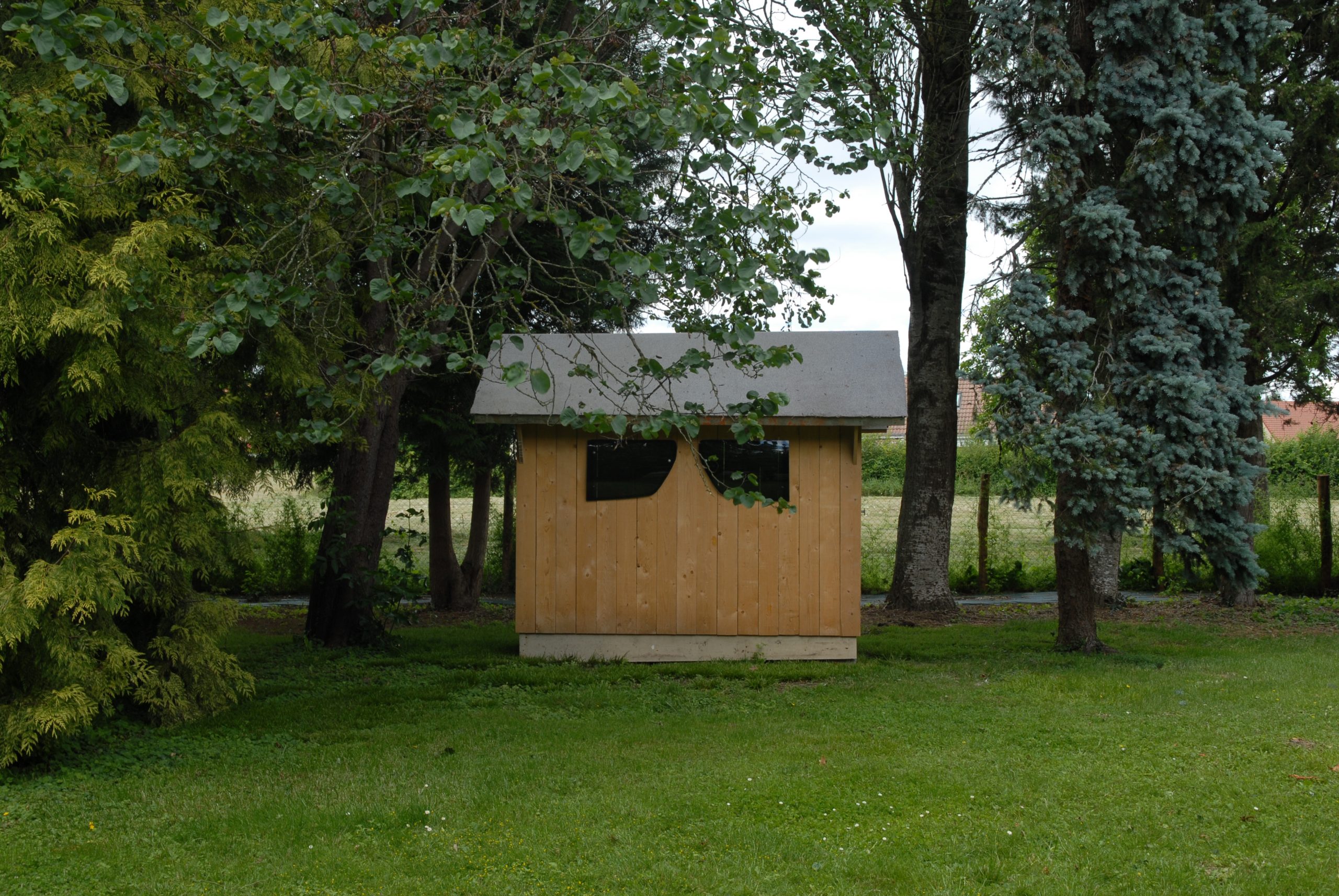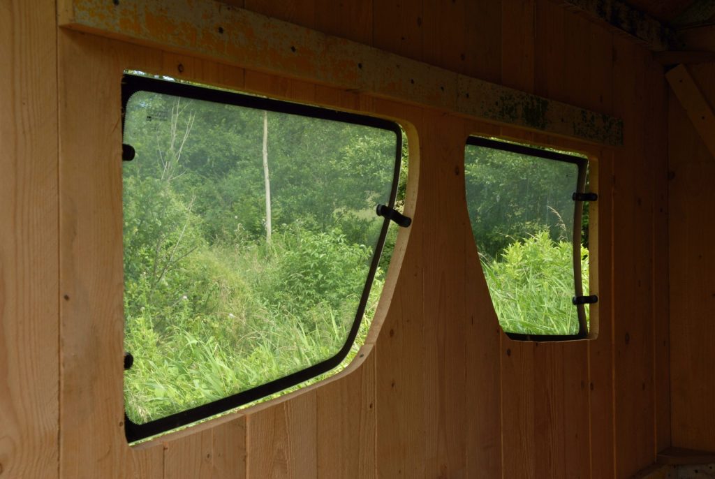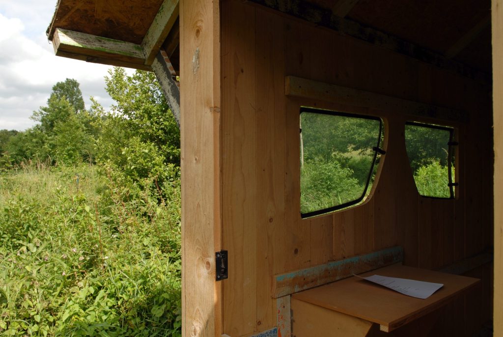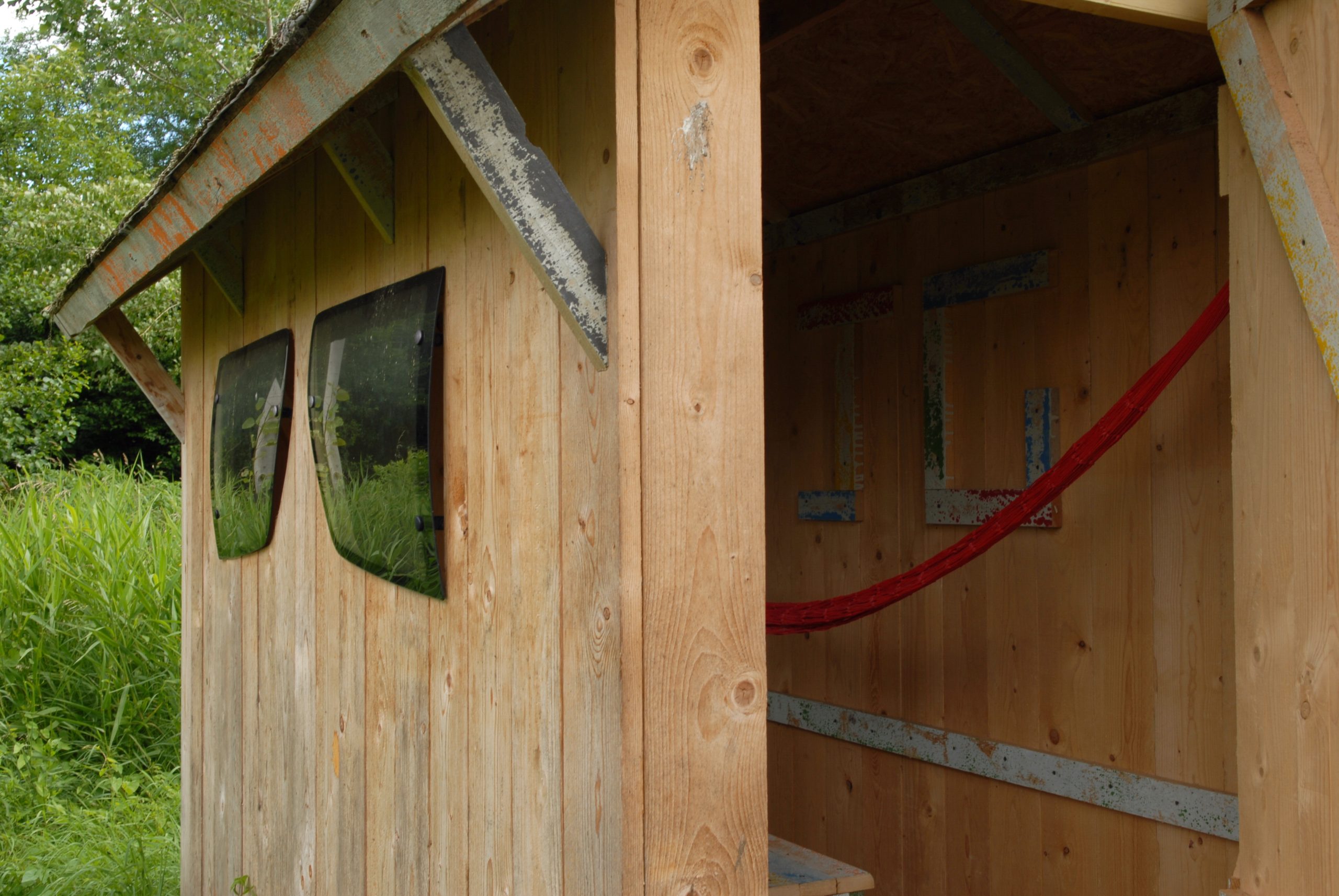 D.M.Clarke reprend les proportions des cinq grandes bâtisses où dorment et vivent les détenus pour réaliser sa propre cabane. Il rappelle le mode de vie des jeunes garçons fondé sur la discipline marine – ils accrochaient leur hamac le soir et le dépendait le matin pour pouvoir déplier les tables du petit déjeuner – en installant dans la cabane un hamac et une petite table pliante à la disposition des visiteurs. Le système de surveillance assez dur qui existait à l’arrivée de Jean Genet est suggéré par la forme en verre de lunettes des deux fenêtres ; de l’extérieur, elles évoquent aussi bien les oculi du beffroi des églises que des maisons du directeur des usines paternalistes tandis que de l’intérieur, il semble au visiteur qu’il regarde le paysage alentour par les orbites d’un géant , depuis l’intérieur de son crâne. De cette manière, la Cabane pour Jean Genet dépasse son simple statut de sculpture pour se transformer en un objet tridimensionnel, une sorte de chambre proche de la camera obscura destinée non pas à être vue mais conçue comme un point d’observation donnant sur le monde extérieur. Pour ne pas tomber dans le piège de l’illustration et de la nostalgie, D.M.Clarke demande au poète Pierre Giquel d’écrire un texte à Jean Genet, poème laissé dans la cabane, à la vue de tous.