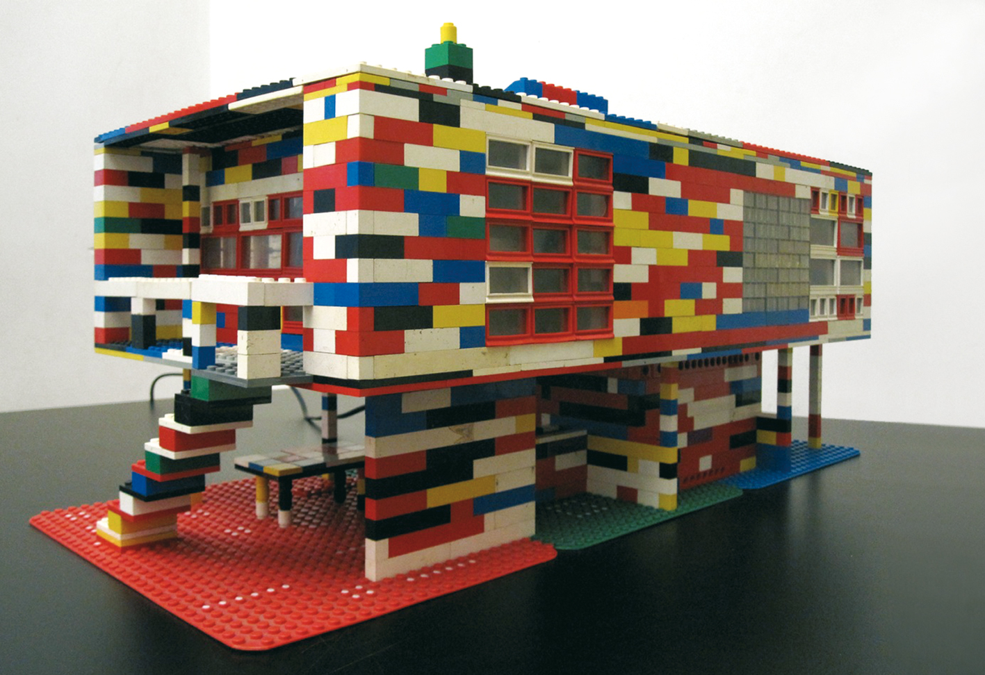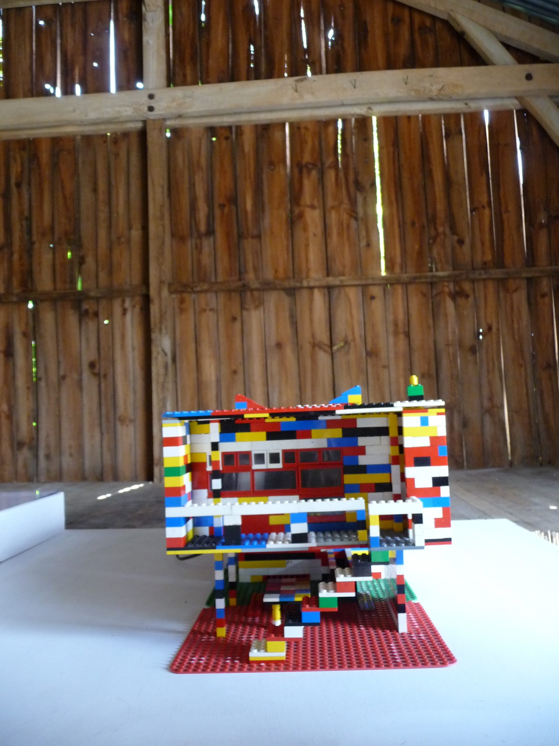 Avant même la sortie de la Villa Savoye par la série Lego Architecture (2012), Christophe Terlinden crée en 2010 “Lego Blaster”, une réplique en petites briques célèbres du Logis du paysan que Le Corbusier et Norbert Bézard imaginèrent en 1934 dans leur projet de “Ferme radieuse et de village coopératif”. Le “Blaster” fait quant à lui référence à une autre pièce de l’artiste : le Ghetto Blaster (2009), reconstitution de l’abbaye de Grimbergen sous forme de l’emblématique radio cassettes des années 1980. La bande sonore du Ghetto Blaster émettait des morceaux musicaux joués par le carillon de l’abbaye de Grimbergen ; celle du Lego Blaster émet les sons de 24h passées à Piacé au rythme des cloches de l’église et des tracteurs…