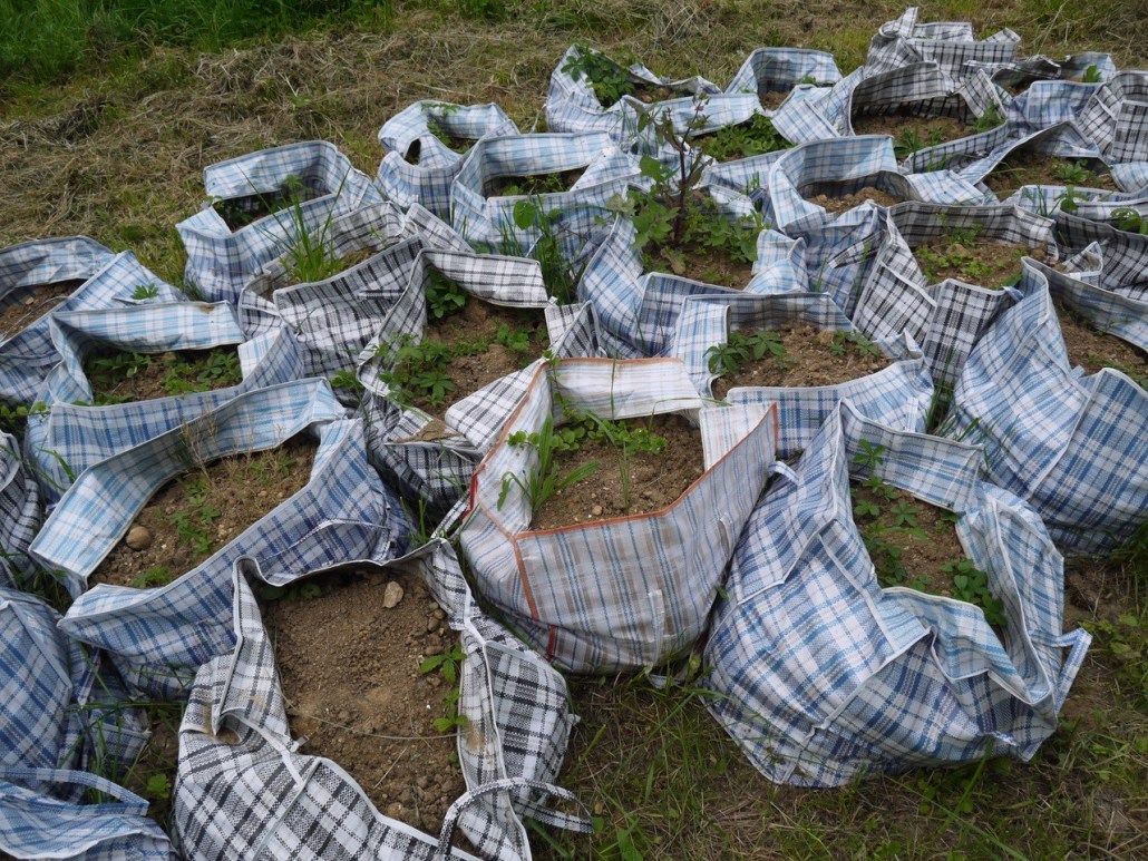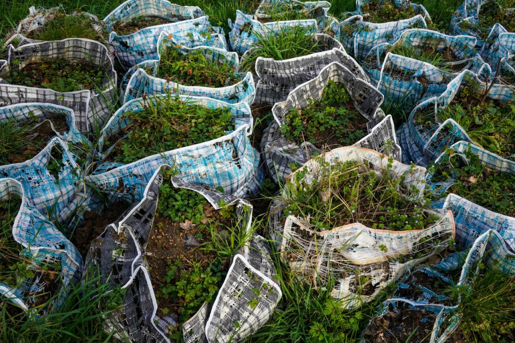 La terre est de préférence non amendée. Elle provient de friches urbaines ou de champs situés à proximité de l’installation. Il convient de les disposer ouverts, offerts à la nature. Le processus est naturel. Il n’est donc pas nécessaire de les arroser, n’y d’intervenir d’aucune façon. La zone autour des sacs doit être nettoyée de façon à ce que les sacs ne soient pas dissimulées par une végétation envahissante. Avec le temps, les plantes rudérales vont se développer et envahir petit à petit toute la surface des sacs. Les sacs sont amenés à disparaître avec le temps sous l’action des intempéries et de la possible destruction par divers oiseaux qui utilisent les fibres synthétiques des sacs pour la confection de leur nid. Les sacs sont donc amenés à disparaître. L’installation à terme rejoint la terre sur laquelle elle repose, si c’est le cas.