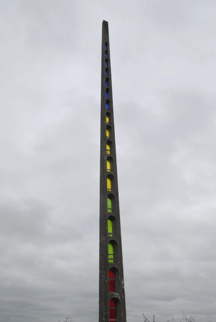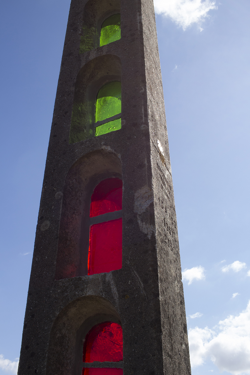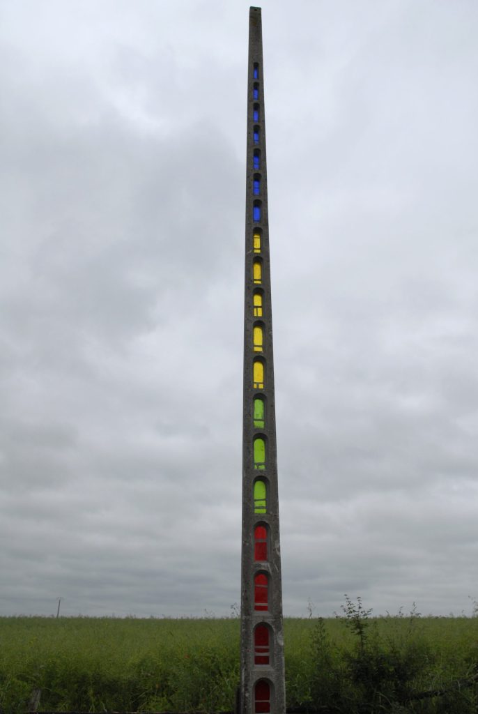 Longuement mûrie pendant 10 ans, la pièce présentée par Stéphane Vigny convoque aussi bien l’art dit savant que l’art populaire, étroitement mêlés dans cet art d’idée que pratique l’artiste. Inscrit dans sa réflexion sur les « objets modifiés », ce poteau électrique (dont la production par l’entreprise sarthoise Garzinsky Traploir commence après la Première Guerre mondiale et s’interrompt) présente des alcôves vitraillées selon une technique de « greffe et de juxtaposition » selon les mots de l’artiste. En effet, il joue à rapprocher des univers très différents (celui de la production industrielle et sérielle et celui de l’architecture religieuse) par un système d’analogie : les alvéoles du poteaux rappellent la forme des fenêtres romanes en plein cintre. De cette manière, il crée un lien fort entre son œuvre et l’église de Piacé dont les vitraux respectifs ont été réalisés selon la technique des dalles de verre cimentées (et non plombée) mise en point dans les années 30 – c’est à dire au moment même où Le Corbusier et Bézard réfléchissent au Centre coopératif et à la Ferme radieuse.