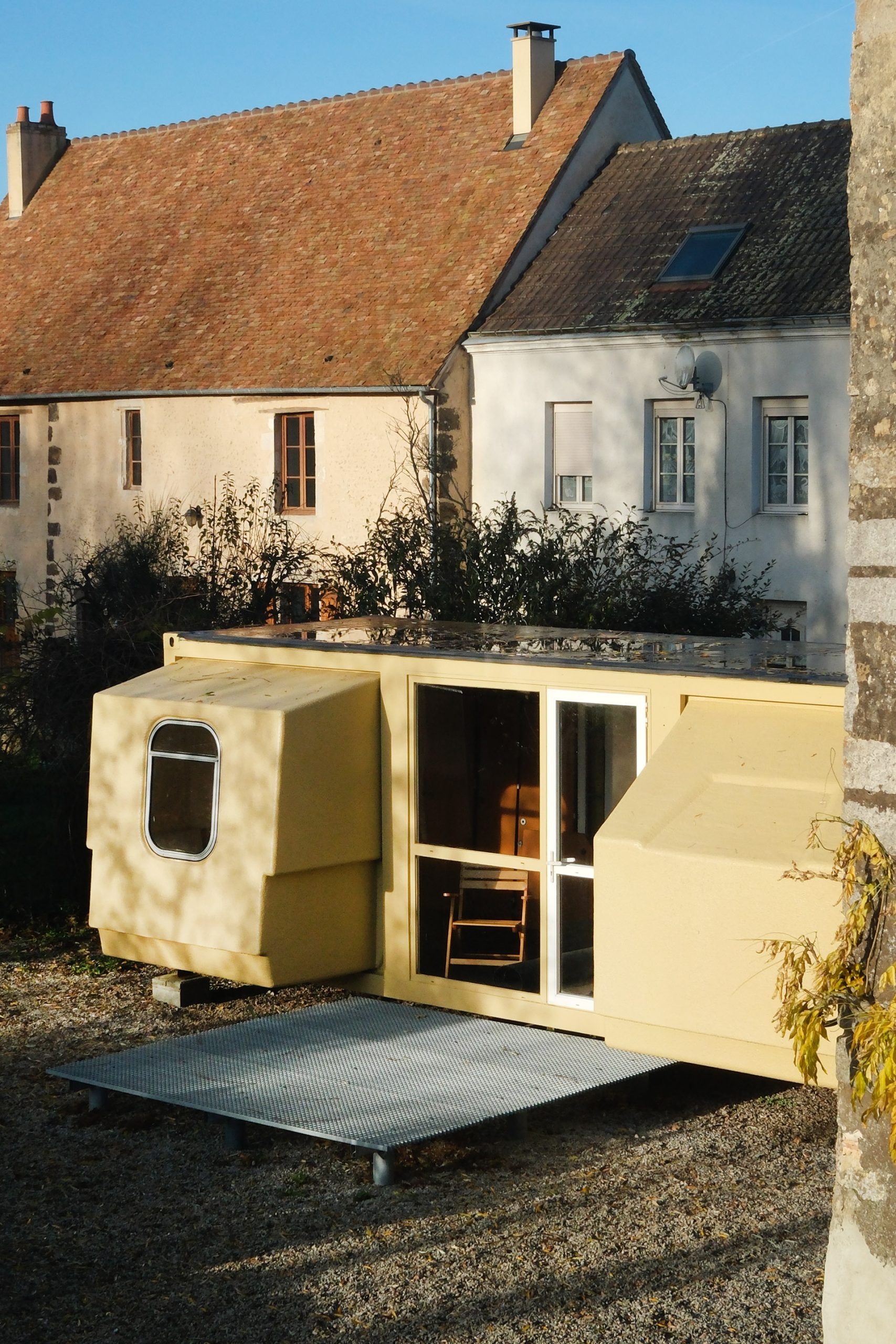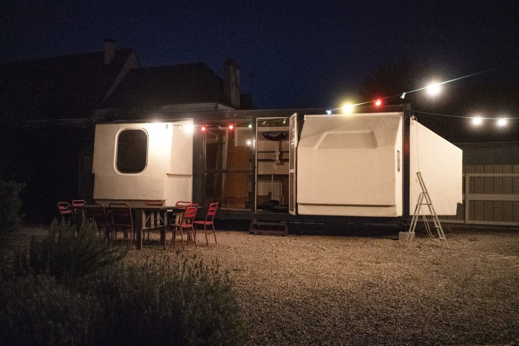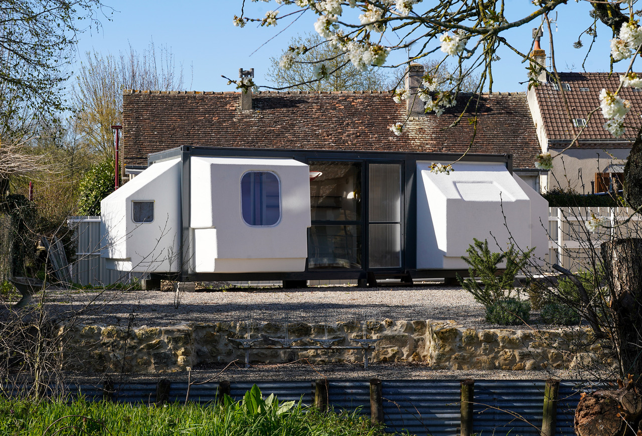 À l’instar de la Bulle Six Coques, de l’Hexacube ou encore de la Futuro, le Tétrodon est une micro et mobile architecture utopiste née des Trente Glorieuses. Il doit son nom au poisson éponyme, le poisson-coffre, et ,comme celui-ci, a la capacité de doubler son volume initial (un container de 30 pieds) en gonflant des dents latérales (doubles coques plastiques rétractables)… Pour en savoir plus : https://renamimoa.jimdofree.com/le-tetrodon/